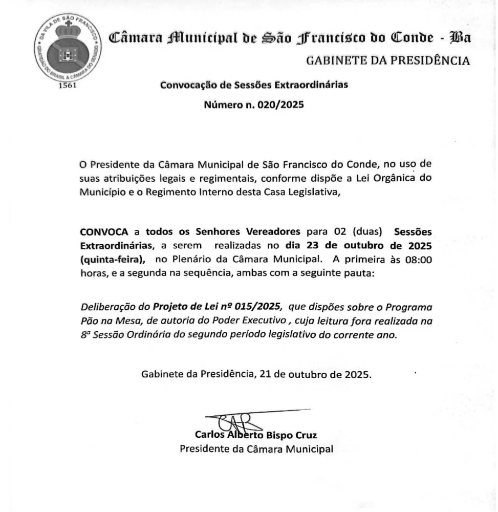 O presidente da Câmara Municipal de São Francisco do Conde, Carlos Alberto Bispo Cruz, conhecido como Nem do Caípe, convocou duas sessões extraordinárias para a próxima quinta-feira, 23 de outubro de 2025, com o objetivo de deliberar sobre o Projeto de Lei nº 015/2025, de autoria do prefeito Antônio Calmon, que trata do programa social “Pão na Mesa”.