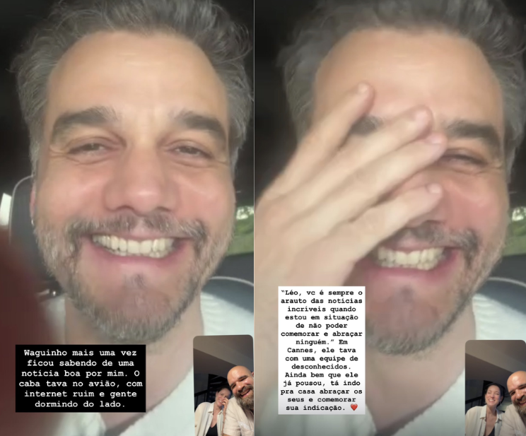 "Waguinho, mais uma vez, ficou sabendo de uma notícia boa por mim. Em Cannes, ele tava com uma equipe de desconhecidos. Ainda bem que ele já pousou, tá indo pra casa abraçar os seus e comemorar sua indicação", disse Leonardo.
