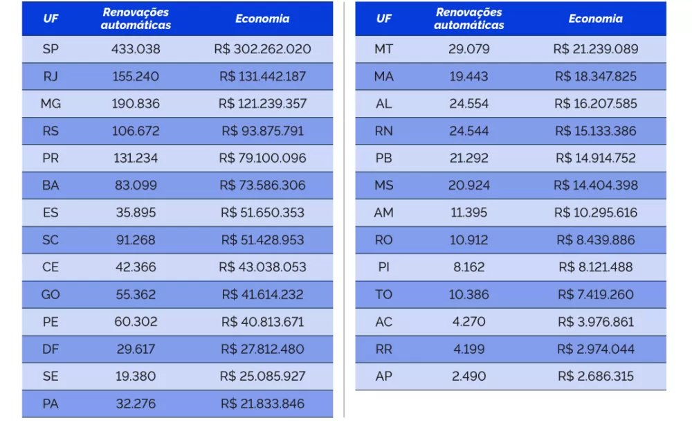 Entre os estados, São Paulo ocupa a primeira posição, com R$ 302,2 milhões em economia, seguido por Rio de Janeiro e Minas Gerais. A Bahia aparece entre os destaques nacionais, com R$ 73,6 milhões economizados.